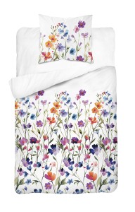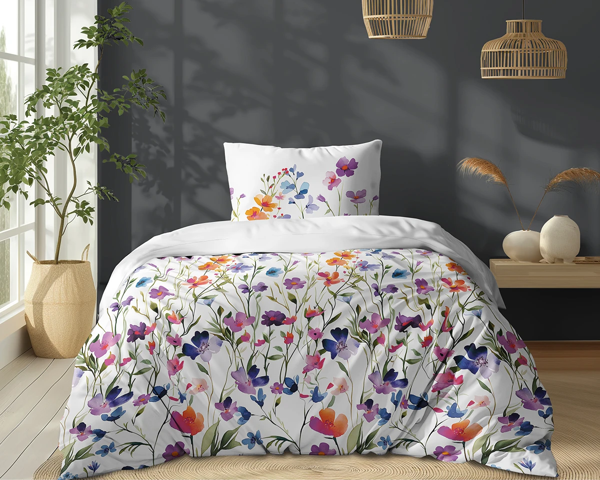 Wzór tej pościeli zachwyca kolorowymi, drobnymi kwiatami w odcieniach fioletu, różu, pomarańczu i błękitu, które subtelnie układają się w lekką, pionową kompozycję na jasnym, świeżym tle. Motyw przypomina radosną, letnią łąkę, wprowadzając do wnętrza energię, świeżość i pozytywny nastrój.