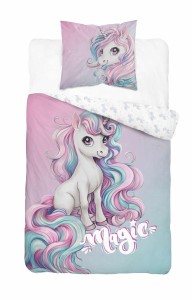 Na pościeli znajduje się piękny jednorożec z pastelową, falującą grzywą oraz napis „Magic”, który pobudza wyobraźnię i przenosi dziecko do świata fantazji, snów i bajek. To idealne otoczenie do spokojnego zasypiania i kolorowych snów.