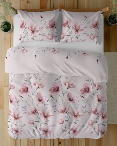 Wzór tej pościeli zachwyca delikatnymi, pastelowymi kwiatami w odcieniach różu i subtelnej zieleni, rozproszonymi na jasnym tle. Motyw przypomina lekki, wiosenny ogród – jest elegancki, ale jednocześnie bardzo przytulny i spokojny. Cienkie gałązki oraz miękkie linie nadają całości lekkości, dzięki czemu pościel nie przytłacza wnętrza, lecz pięknie je rozjaśnia.