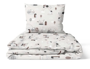 Wprowadź do dziecięcego pokoju przytulność i fantazję z wyjątkową pościelą w uroczy wzór koparek, balonów i tęczy. Utrzymana w spokojnych, beżowo-brązowych tonach, będzie pasować do wielu aranżacji wnętrz – idealna zarówno dla chłopców, jak i dziewczynek.