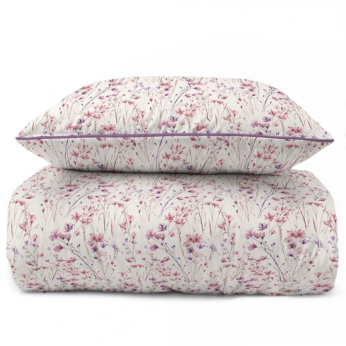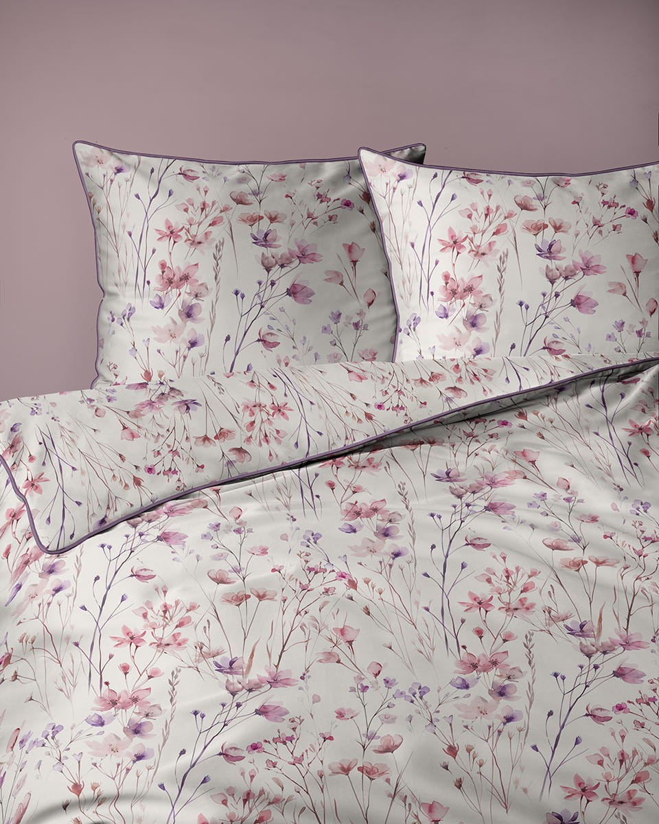 Pościel z perkalu w subtelny, łąkowy wzór to wyjątkowo lekka i romantyczna propozycja do sypialni, w której liczy się spokój, naturalność i delikatna elegancja. Drobne, finezyjne kwiaty przypominające polne rośliny w odcieniach pudrowego różu, lawendy i przygaszonej zieleni tworzą zwiewną kompozycję na jasnym, kremowym tle. Całość uzupełnia elegancka lamówka w odcieniu zgaszonego fioletu, która podkreśla staranne wykończenie i dodaje całości wyrafinowanego charakteru.
