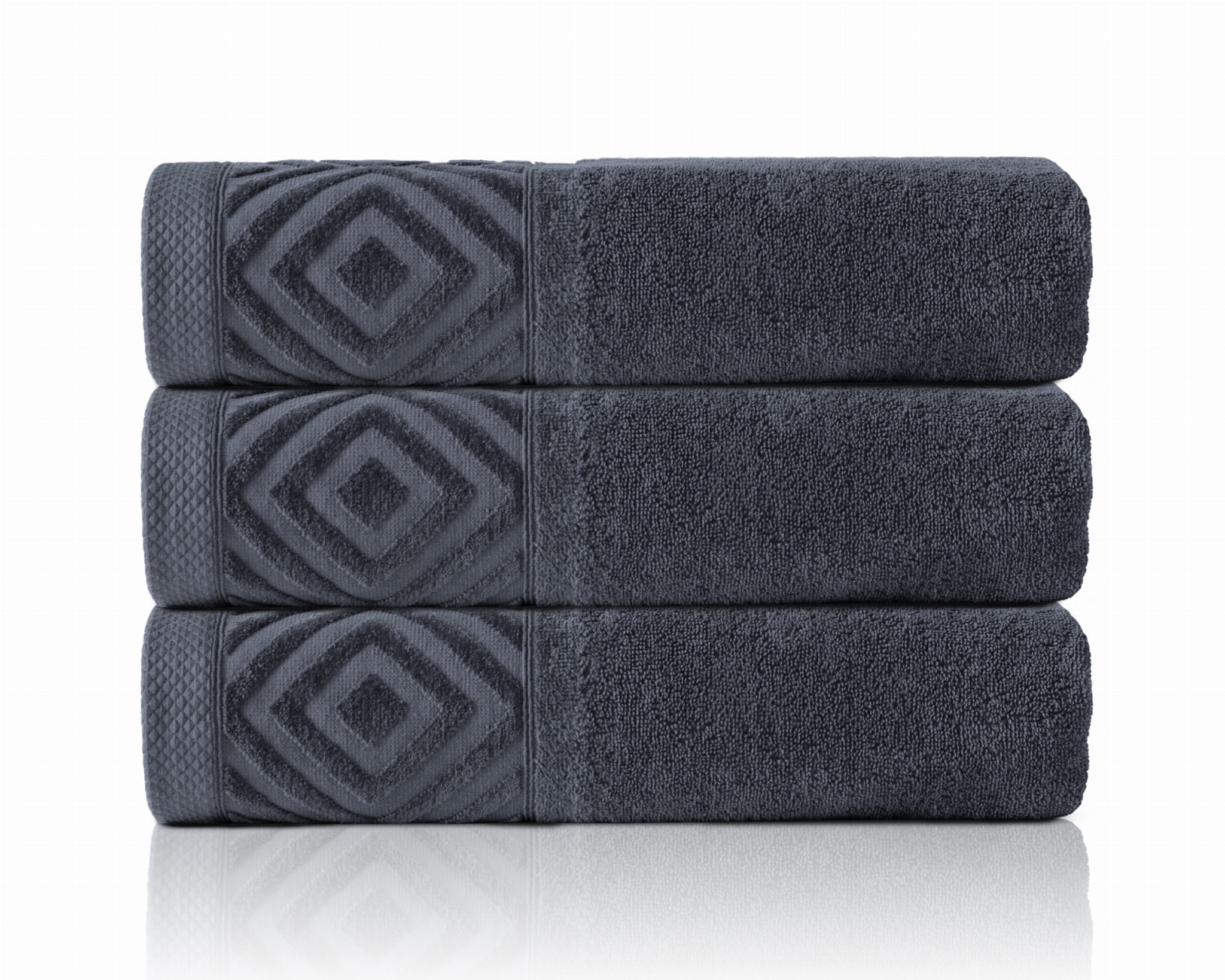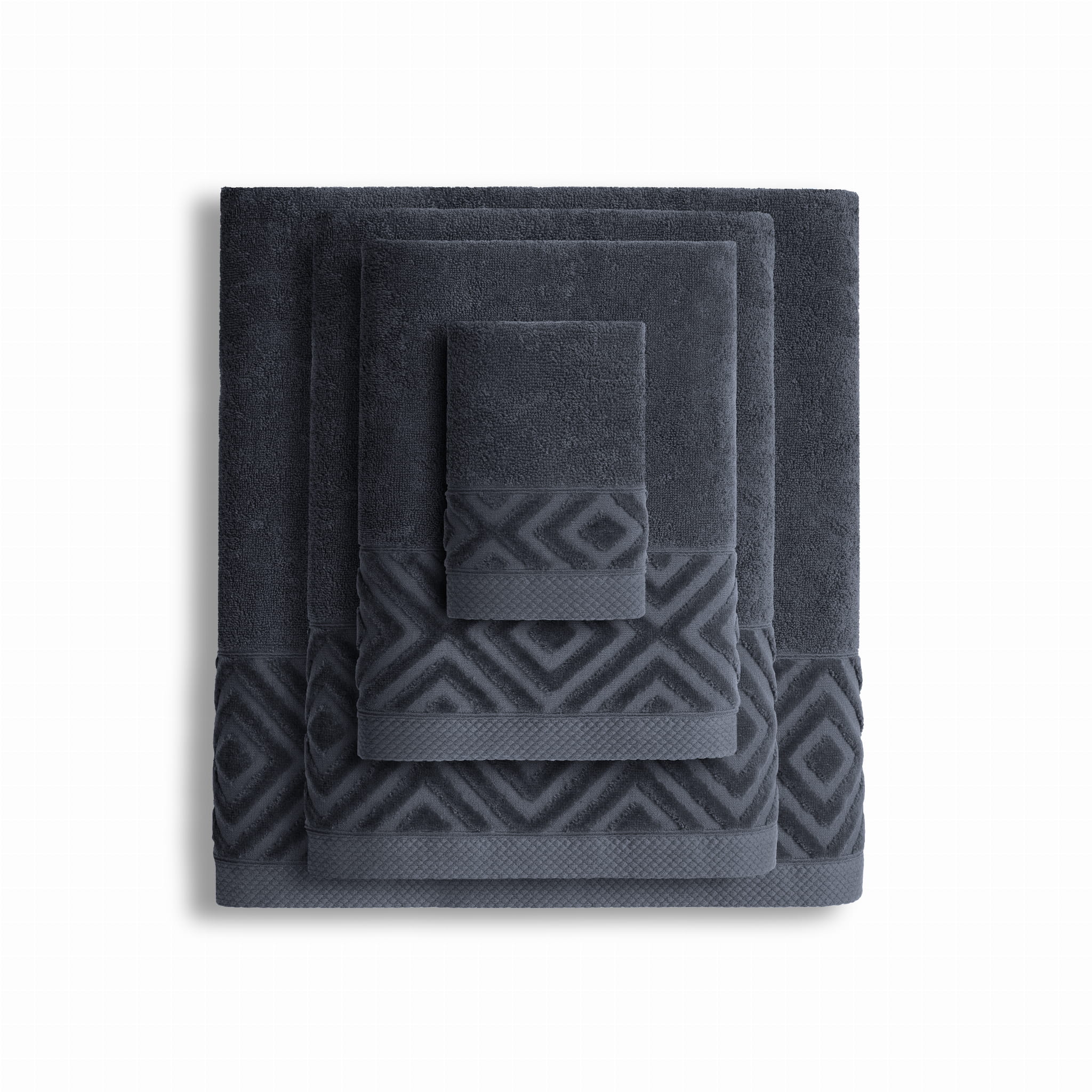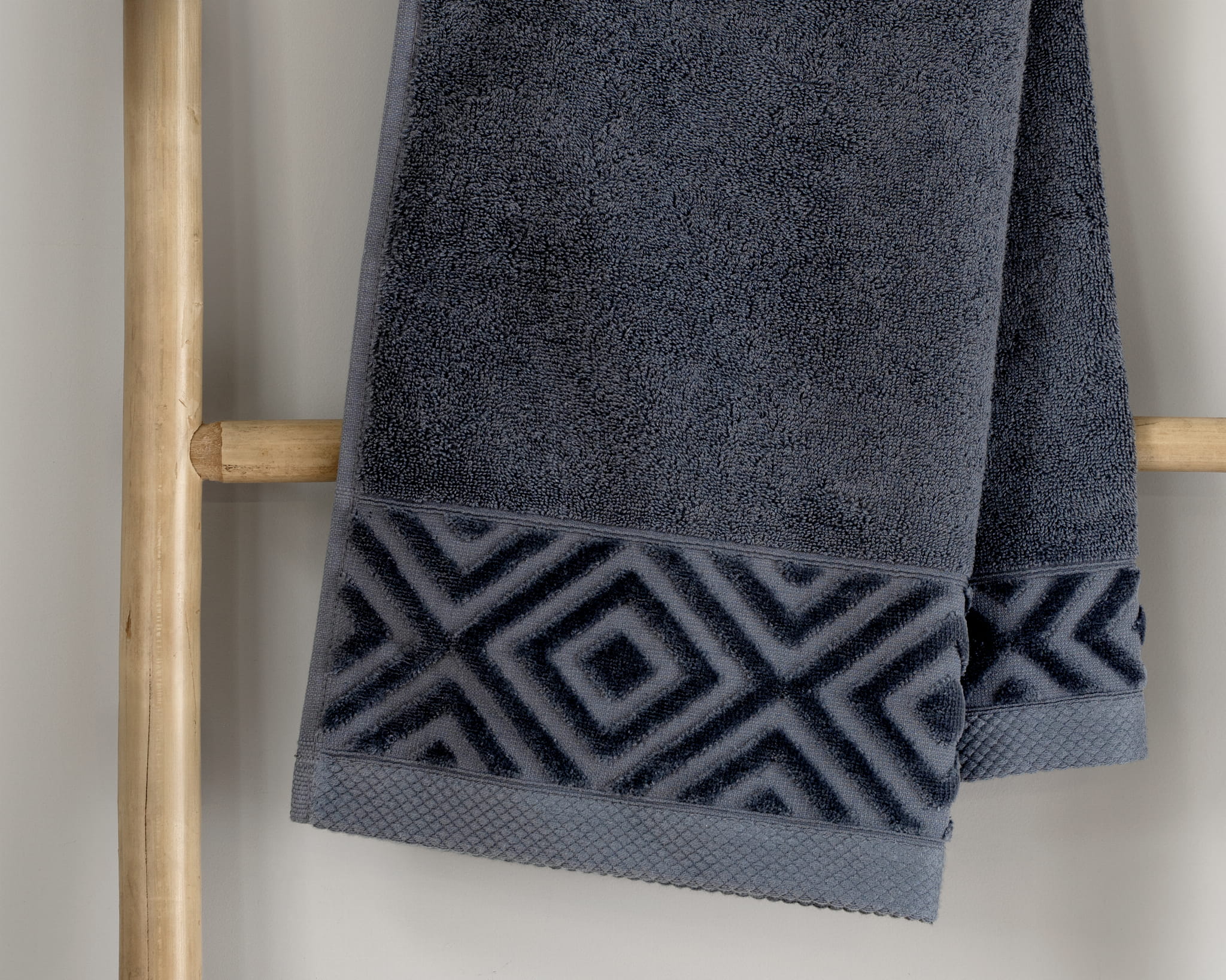 Dekoracyjna bordiura z geometrycznym wzorem nadaje ręcznikowi nowoczesny i stylowy charakter, dzięki czemu świetnie sprawdzi się zarówno w domowej łazience, jak i w obiektach hotelowych czy SPA.